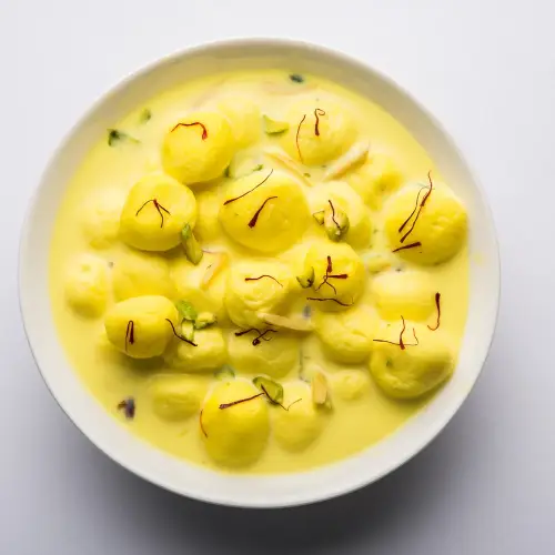 KBM Angoori Rasmalai is a delightful dessert made with soft mini chenna balls soaked in rich, flavorful sweet milk for a creamy and refreshing taste.