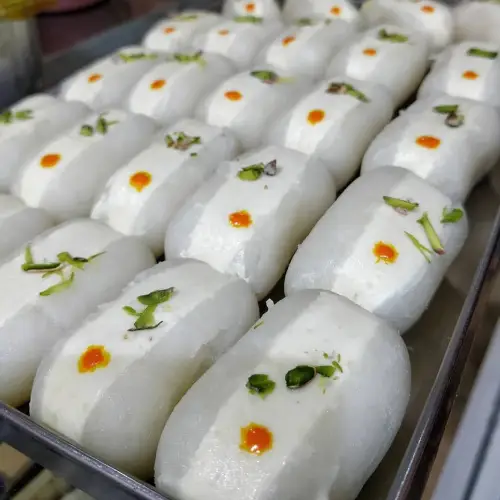 KBM Chamcham is a delicious Bengali sweet made from fresh chenna, known for its soft texture and rich traditional flavor.